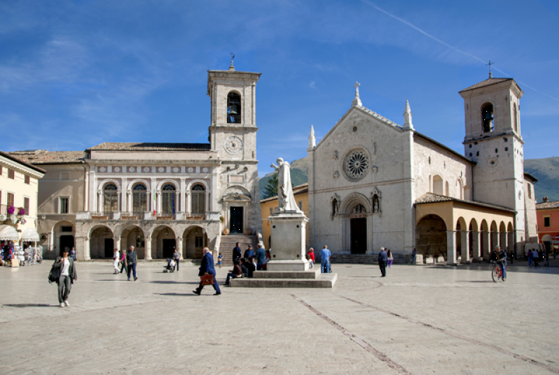 All’interno della cerchia muraria il fulcro della vita urbana è da sempre l’attuale piazza San Benedetto, dove le linee armoniose dei principali edifici civili, il Palazzo Comunale e la rocca detta la Castellina, e religiosi, la Basilica di San Benedetto e la Cattedrale di Santa Maria Argentea, rappresentano un angolo di storia italiana rimasto miracolosamente intatto nei secoli.