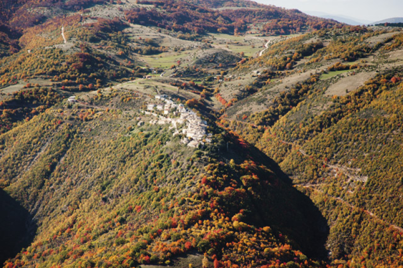 Il borgo di poggio sorge su un colle con vista panoramica sulla valle del Tissino e su Monte Maggio ai margini dei Piani dell’Immagine: un altopiano a 1150 metri di quota che si apre lungo i versanti settentrionali del massiccio del Monte Coscerno, da sempre utilizzato per il pascolo e coltivazioni di montagna