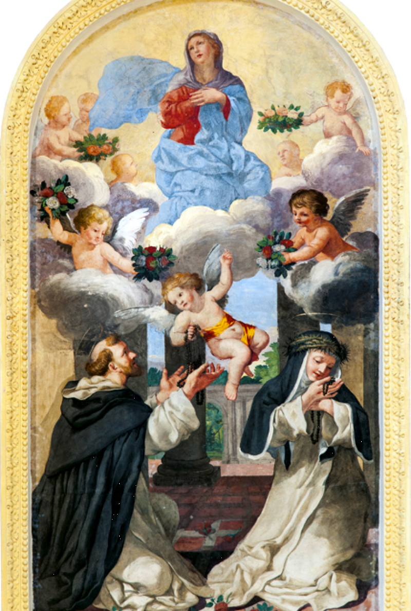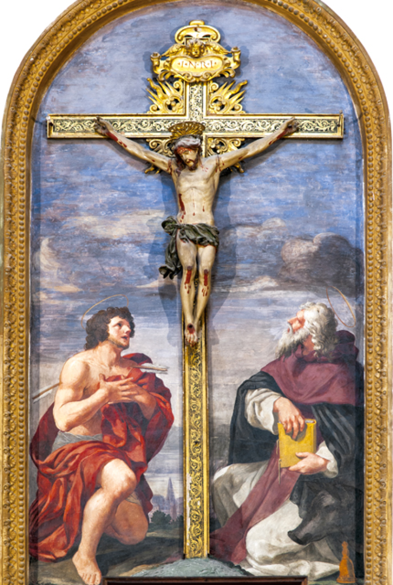 Nella cappella posta alla sinistra della porta di ingresso vi è una raffigurazione di Santa Rita da Cascia, di autore ignoto, cui si aggiunge una preziosa acquasantiera. Nel primo altare, un affresco raffigurante l’Incontro tra i SS Pietro e Paolo, è attribuibile a uno dei collaboratori di Salvi Castellucci. Nel secondo altare, la Madonna del Rosario con i Santi Domenico e Caterina da Siena, opera di Salvi Castellucci. Dietro l’altare maggiore si conserva una preziosa Trasfigurazione, opera di Giovanni Maria Colombi e dei suoi collaboratori. Vi sono inoltre conservati i candelieri donati da Fausto Poli, sul cui piedistallo è scolpito lo stemma gentilizio del cardinale e un bel paliotto con al centro il Crocifisso