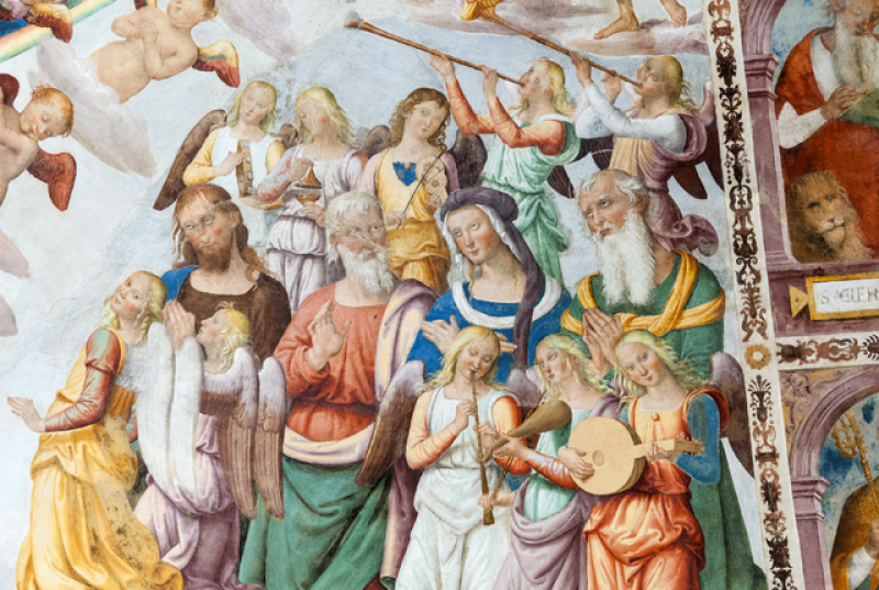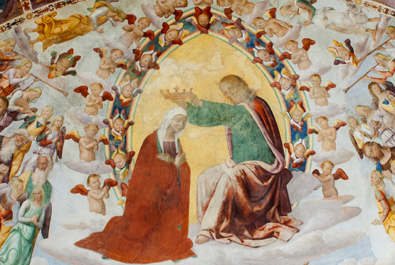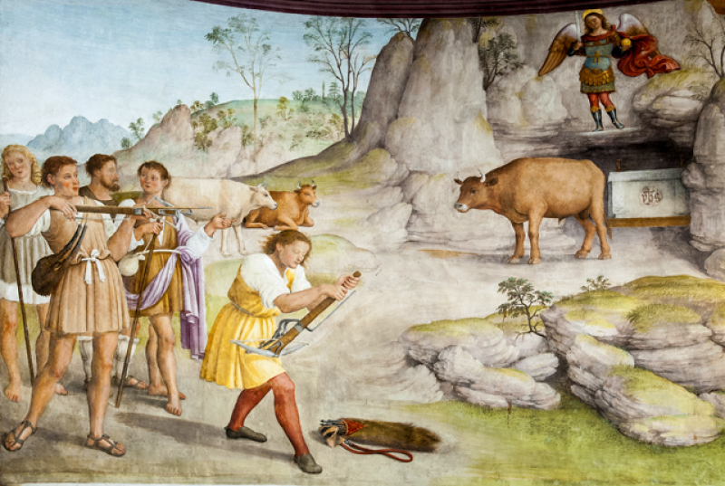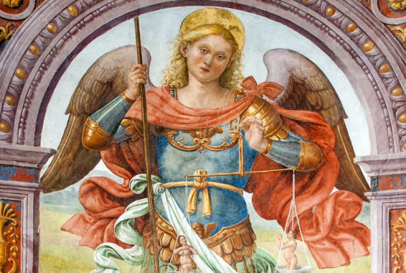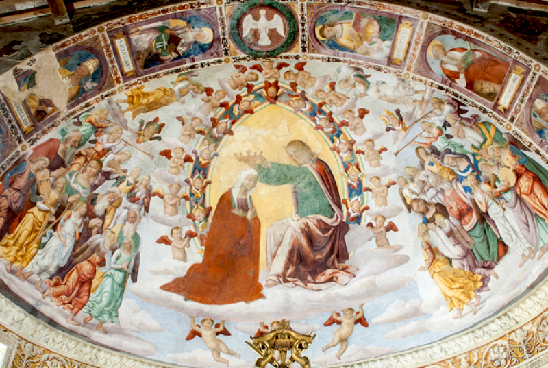 Nell’abside, dove vi è la firma di Johanne Hispano, l’Incoronazione della Vergine e l’immagine di San Michele Arcangelo che calpesta il dragodemonio e pesa le anime, iconografie molto diffuse in Umbria. Di notevole importanza artistica, in cui è visibile l’influenza di Rafaello, è la scena dell’apparizione di San Michele Arcangelo e del toro in una grotta del Monte Gargano di fronte ad un gruppo di balestrieri.