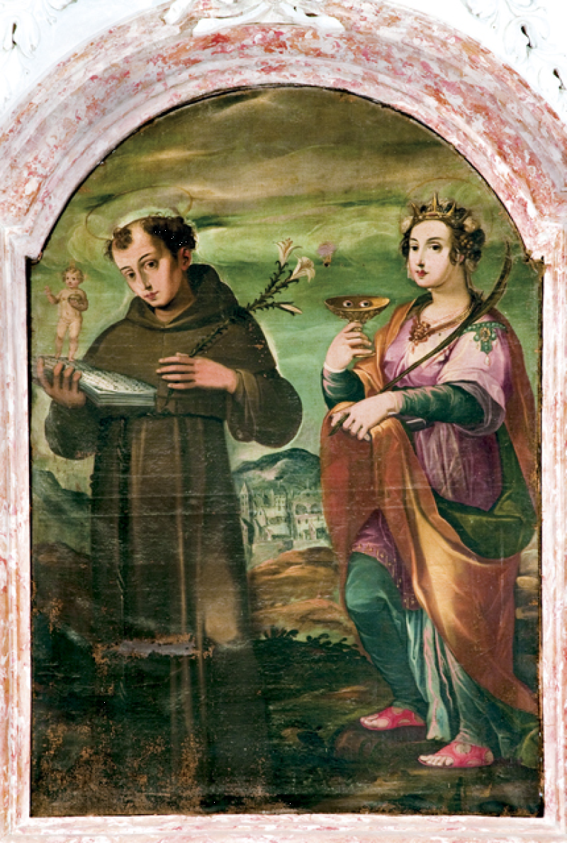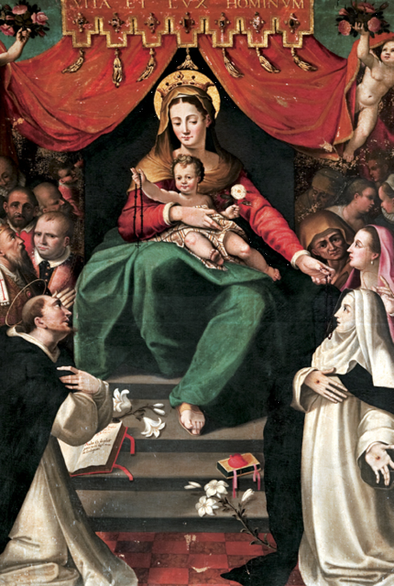 Quando la tela fu dipinta, era ancora vivo il ricordo della vittoria di Lepanto (1571), che mutò le sorti d’Europa. Alla vigilia, Pio V aveva donato una corona del rosario a ciascuno dei combattenti della flotta cristiana. Entrando nell’abside, il tamburo è affrescato con tre soggetti: a sinistra la Natività con paesaggio, pastori sullo sfondo e due figure in ginocchio che parrebbero rappresentare il maestro e il discepolo autori degli affreschi. Al centro, un maestoso S. Nicola.