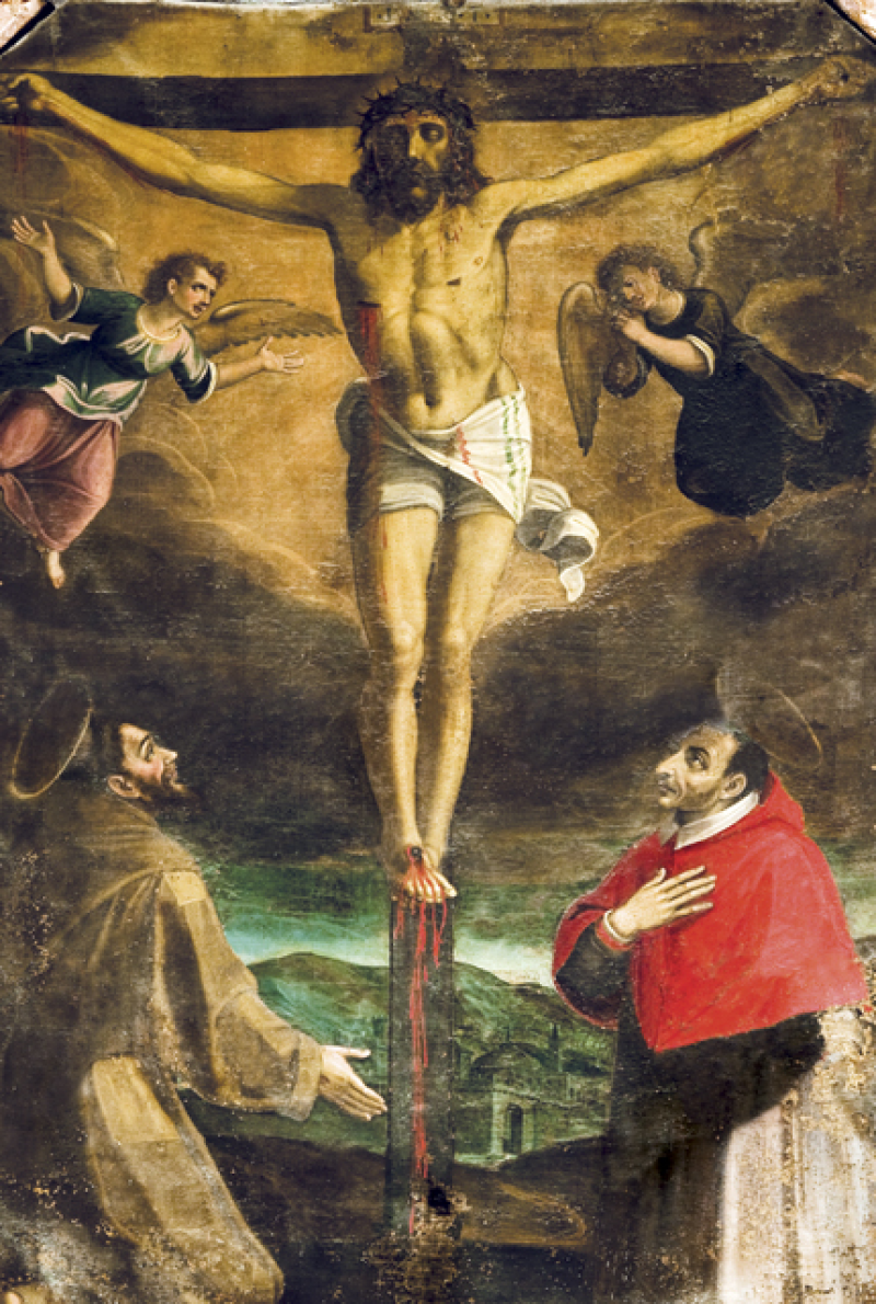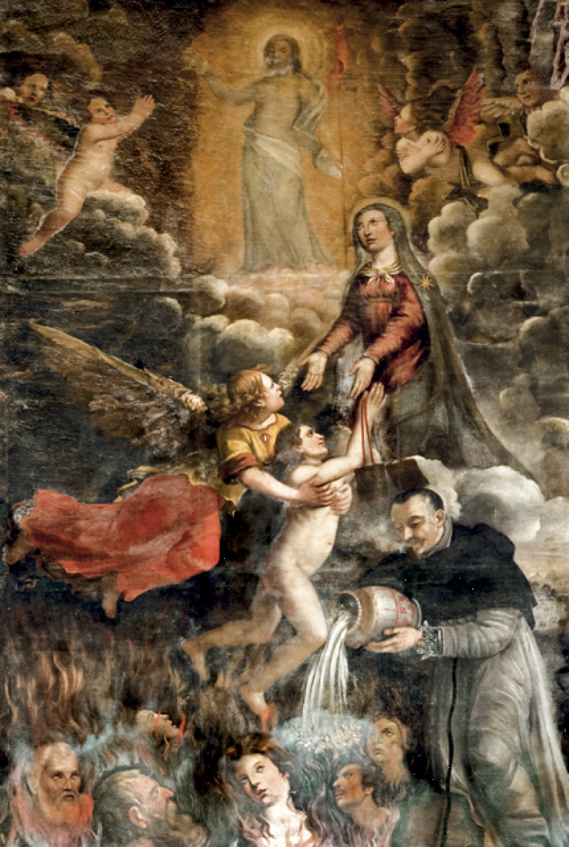 L’altare seguente, dedicato a S. Francesco d’Assisi, è detto “Del Perdono” perché, come recita la tabella, per concessione di Papa Pio VII, dal primo d’agosto fino ai vespri del giorno seguente vi si può lucrare l’indulgenza plenaria della Porziuncola. La tela raffigura Cristo tra Francesco e Carlo Borromeo. L’ultimo altare secentesco della navata destra, dedicato alla Madonna del Suffragio, è detto anche “Delle Anime Sante”: in basso, un’anima con in mano lo scapolare, sorretta da un angelo, abbandona le fiamme del Purgatorio e s’invola verso Maria che l’accoglie tendendole le braccia. L’uso dello scapolare, o “abitino”, della Madonna del Carmelo, nel Seicento era ancora assai diffuso: secondo la promessa fatta dalla Vergine a Simone Stok il 16 luglio 1251, il devoto osservante avrebbe ottenuto la liberazione della propria anima dalle pene del Purgatorio nel primo sabato successivo alla morte (“privilegium sabbatinum”, decretato nel 1322). In basso, è raffigurato Mattiangelo Amici, parroco di Scheggino, nell’atto di versare acqua sulle anime purganti, gesto allegorico che testimonia la fede nell’efficacia delle preghiere di suffragio per i defunti. Degne di attenzione sono le immagini settecentesche della Via Crucis, dipinte a fuoco su vetro.nel territorio di Scheggino (anni ‘60