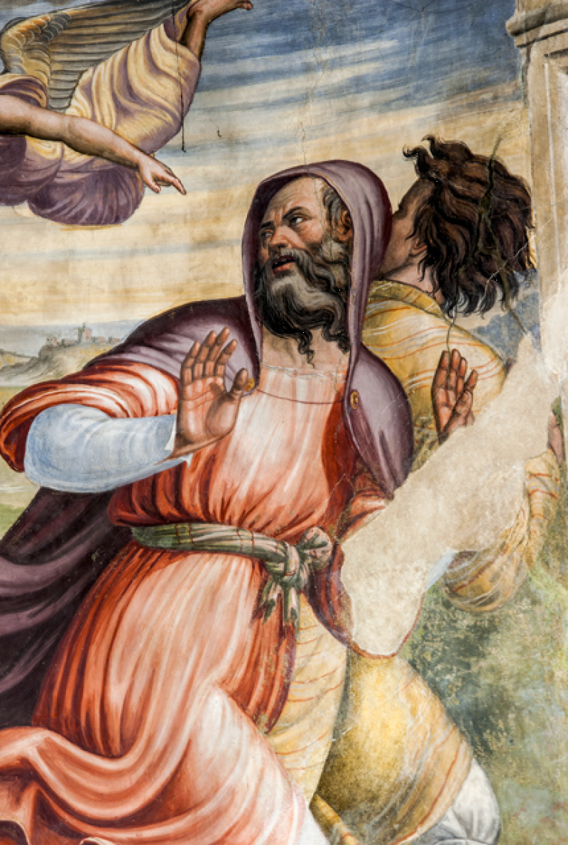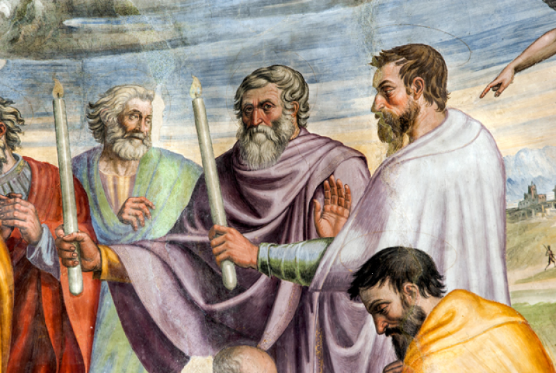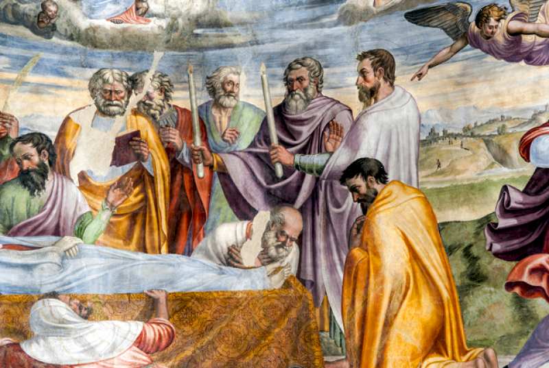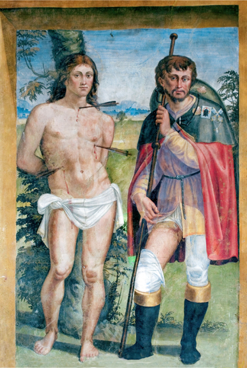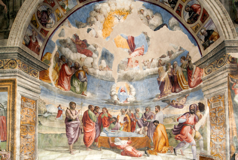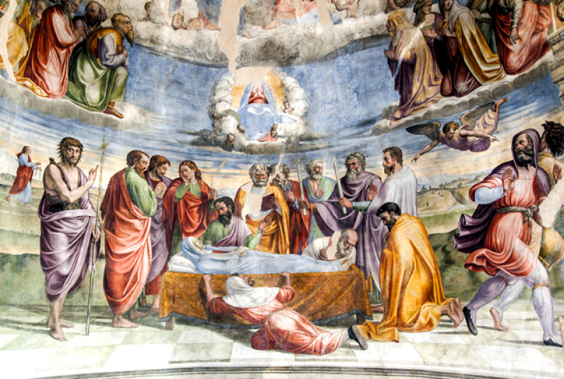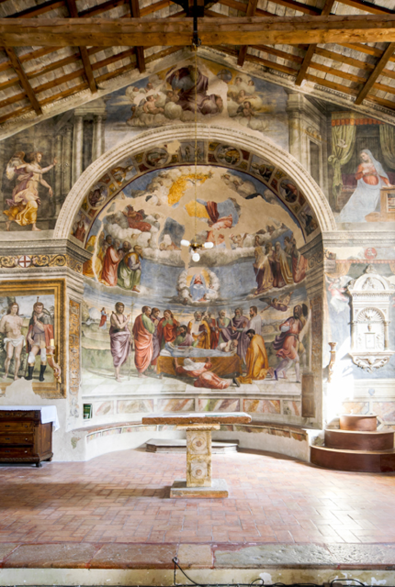 Nella conca, Morte e Incoronazione della Vergine, ispirati alle opere di Filippo Lippi visibili nell’abside del Duomo di Spoleto. Nel sottarco, il Battesimo di Cristo, Evangelisti e Dottori della Chiesa; sulla fronte dell`arco Annunciazione ed Eterno Padre; in basso a sinistra i SS Sebastiano e Rocco e a destra Angeli reggi-cortina (con stemma di Spoleto) ai lati di un tabernacolo in pietra datato 1504. Sul lato destro della navata, una nicchia dipinta scoperta nel 1975 mostra una Crocifissione della metà del sec. XVI. Il Fonte battesimale è in pietra locale e risale al sec. XVI.