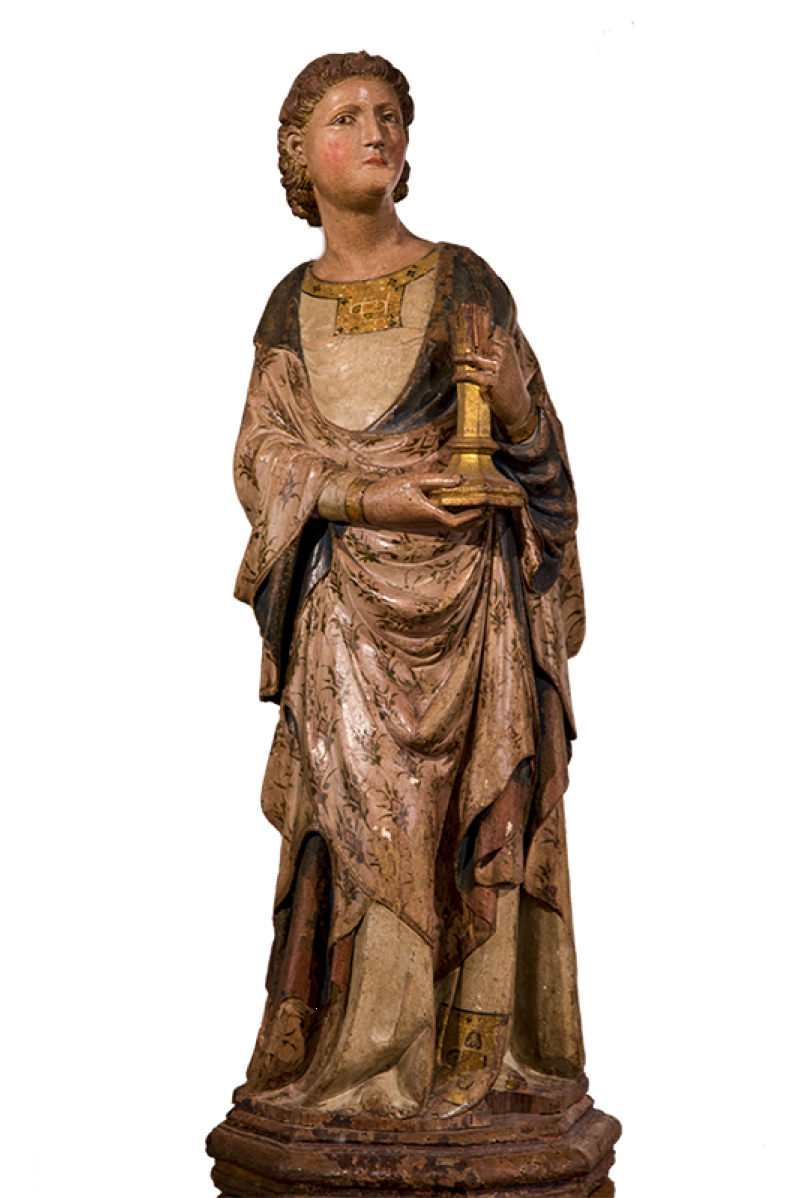 Un’ulteriore sezione del Museo è dedicata alle statue lignee che vanno dal XI al XVI secolo d.C. di eccezionale interesse culturale, attestanti l’importanza del patrimonio dell’arte religiosa nelle terre umbre in epoca medievale. Ne è un esempio la Madonna con il Bambino, realizzata da uno scultore umbro della metà del XIII secolo e rinvenuta nella chiesa di San Fortunato nel borgo di Poggioprimocaso, a pochi chilometri da Cascia. Tra le altre, di notevole rilevanza, la statua di San Bernardino da Siena, rinvenuta nella Chiesa di San Francesco di Cascia e la statua di San Sebastiano proveniente dalla Chiesa di Sant’Agostino. Da poco trasferito dalla Chiesa di Sant’Antonio Abate, il gruppo scultoreo che raffigura l’Arcangelo Raffaele con Tobiolo, realizzato probabilmente da Domenico Indivini nel XV secolo in legno dipinto e dorato.