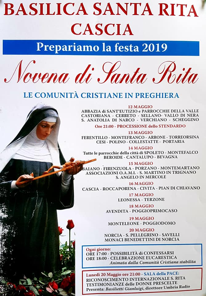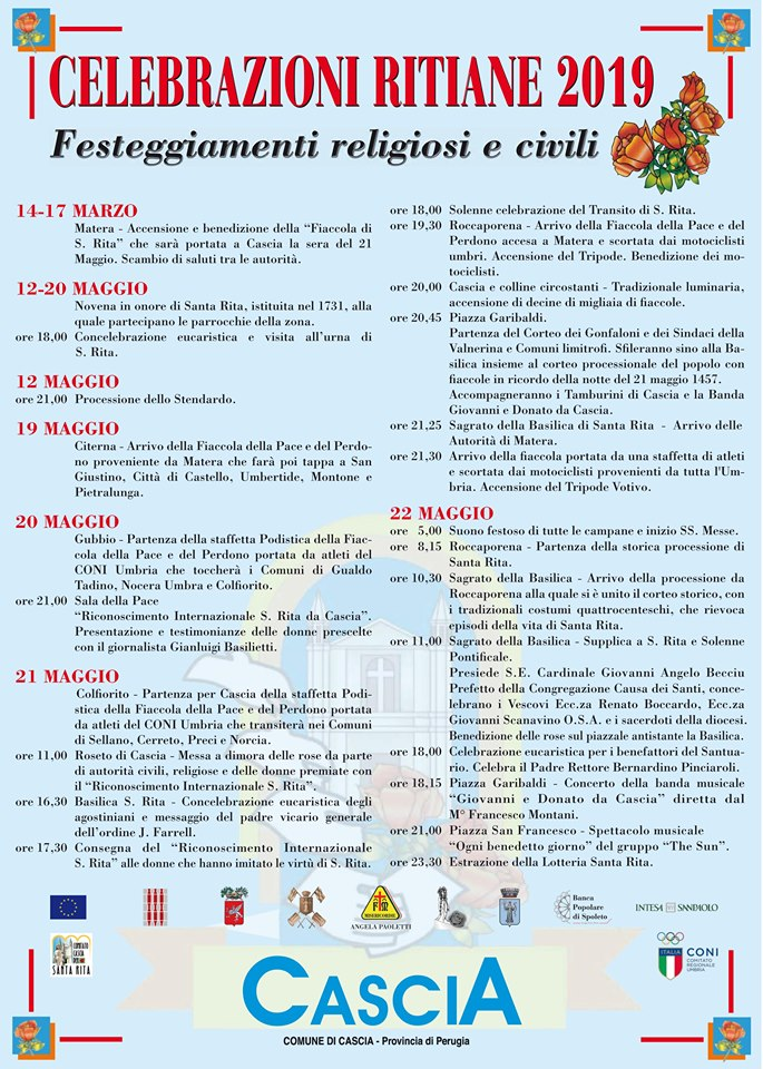 Sono attesi a migliaia, i devoti che da tutta Italia e tutto il mondo arriveranno a Cascia per la grande Festa di Santa Rita, il cui programma culminerà martedì 22 maggio. Le celebrazioni solenni in onore della Santa Patrona di Cascia e delle Cause Impossibili sono curate ogni anno dalla Famiglia Agostiniana, dal Comune di Cascia e dal Comitato Cascia per Santa Rita.