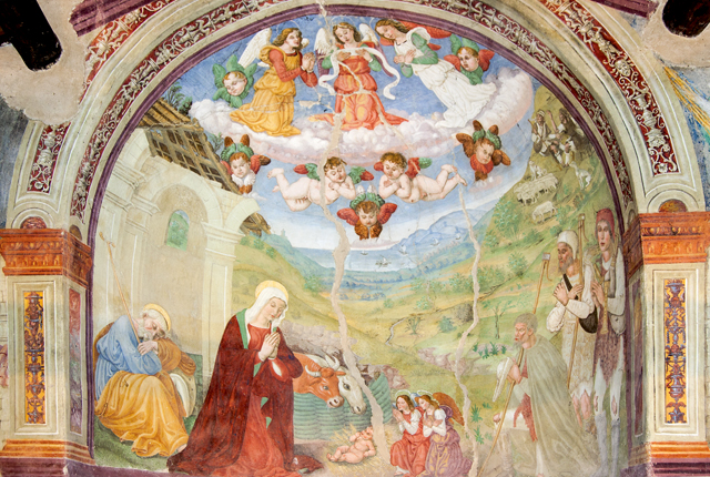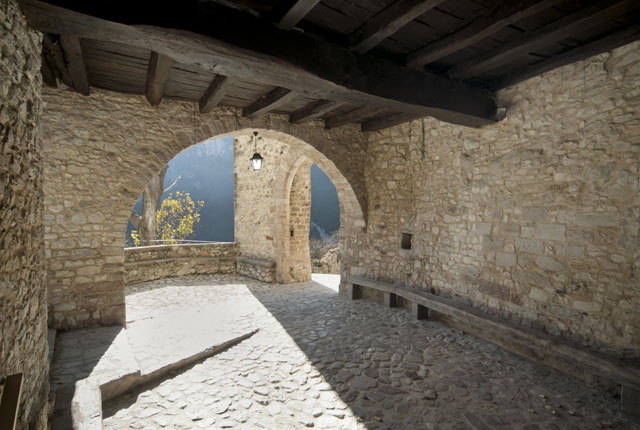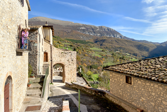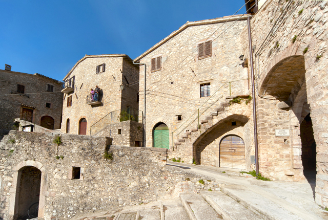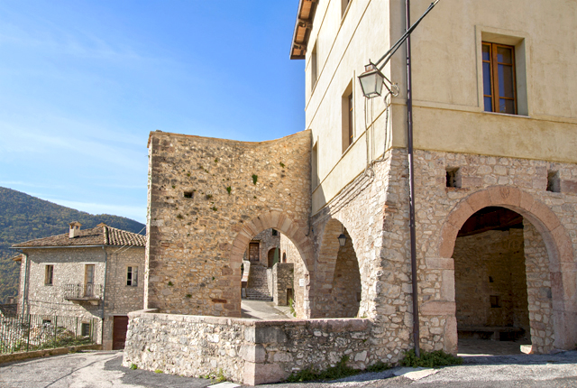It consists of two parts: one, more compact, partially preserving the walls and one of the gate, is rich in typical architectural elements (portals, arched subways and so on). Today the village has been completely restored and it is a nice example of an ancient pastoral town of the Appennino Umbro. In the center of the village is a building, owned by the episcopal Mensa of Spoleto – clearly a former church - where is an attractive room with vaults supported by pillars decorated with Saints, frescoed in the second half of th fifteenth century, according the style of Nicola da Siena.