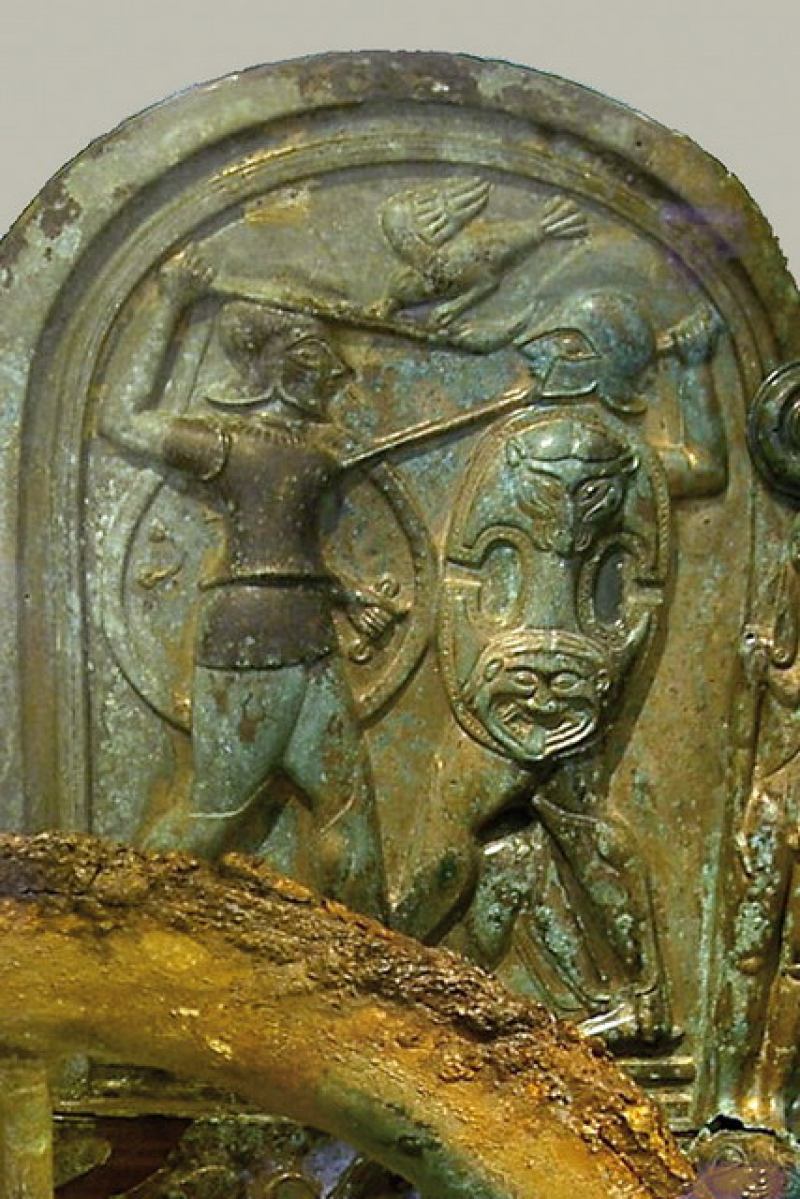 La struttura della Biga è in legno di noce, rivestita di lamine di bronzo come il timone e le ruote ad otto raggi. Nel punto di attacco, il timone fuoriesce dalle fauci di un cinghiale e la sua estremità termina con una testa di uccello teste di serpenti e teste di leoni ornano l’intero carro. La Biga è composta da un trittico di pannelli che riassume l’ideale di vita del guerriero: l’iniziazione con la consegna delle armi; il combattimento glorioso; l’apoteosi finale che rende l’eroe un semidio.