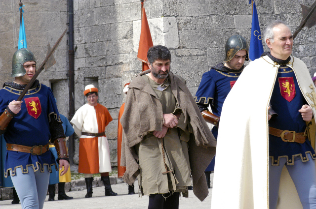 Vengono chiamati, ad uno ad uno, i rappresentanti dei Castelli e ciascuno porta il Palio con il proprio stemma che doveva essere di broccato di seta, d’oro o d’argento; o de seta colorata o di damasco. Seguono poi i rappresentanti delle Guaite che giungono nella Piazza principale, dalle rispettive Guaite.