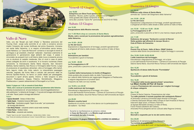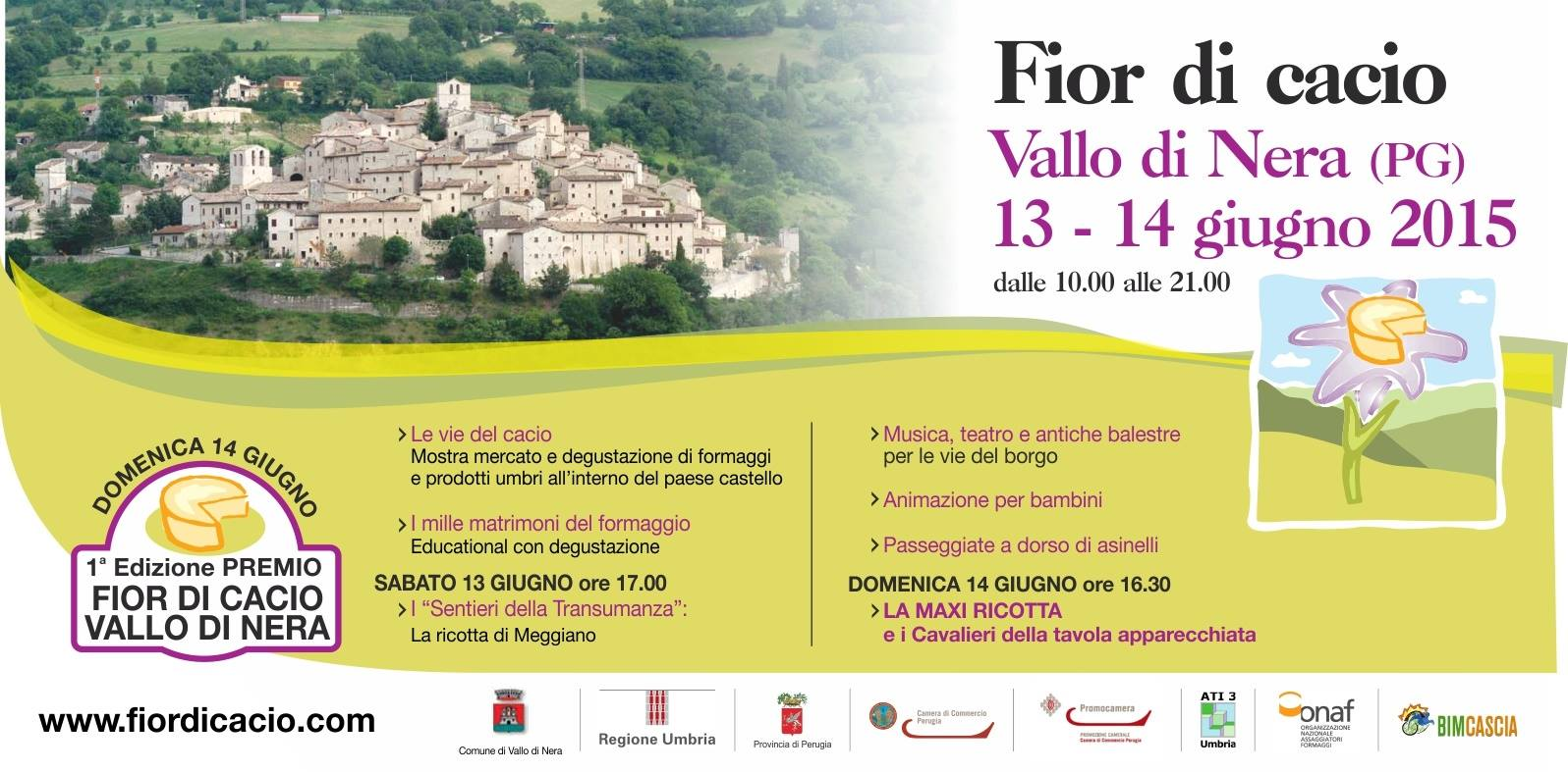 L’inaugurazione della manifestazione sarà sabato mattina alle ore 11,seguirà un workshop sui formaggi della Valnerina, con la presentazione della Guida dei formaggi della Valnerina e del sito web www.fiordicacio.com, curato dall’Associazione di media partner Valnerina in un Click. Fior di Cacio ha il patrocinio della Regione Umbria, della Provincia di Perugia e della Camera di Commercio; in collaborazione con la Pro Loco di Vallo e la Pro Loco di Meggiano, Promocamera, Slow-Food, Cedrav, Onaf, Ati, Gal e associazioni di produttori caseari.