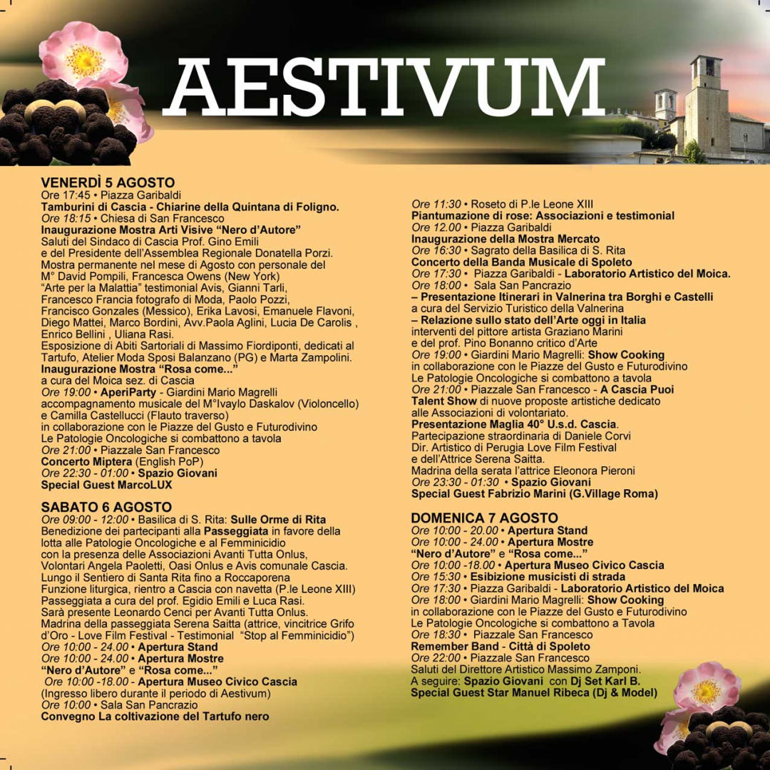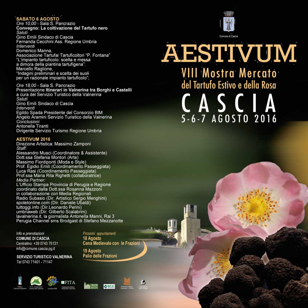 Per gli amanti del tartufo l’appuntamento è da venerdì 5 a domenica 7 agosto, con "AESTIVUM", VIII mostra mercato del tartufo estivo e della rosa.