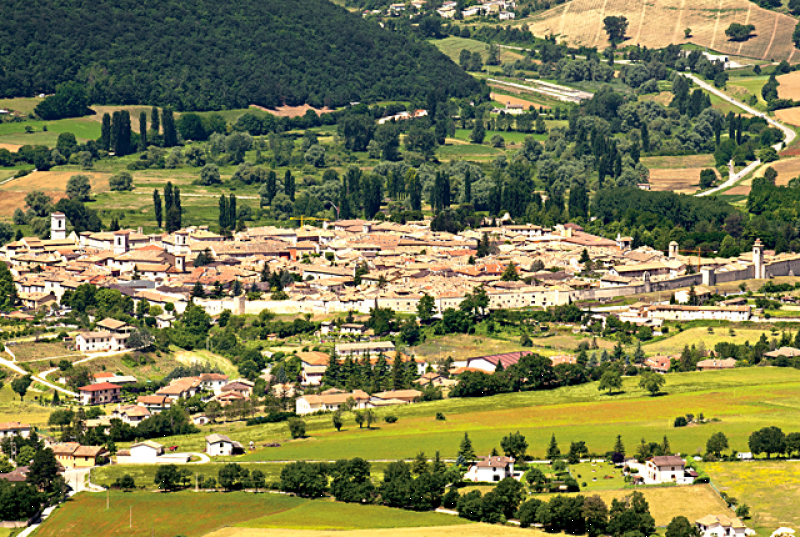 La città orologi replica sabina di Norcia, Patria di San Benedetto e nota per la sua profonda spiritualità, si trova nella parte più montuosa ed incontaminata dell’Umbria, nell’area del Parco Nazionale dei Monti Sibillini, in Valnerina, sul margine meridionale del grandioso Piano di Santa Scolastica, splendido esempio di paesaggio agrario italiano. Al viaggiatore, che giunga in città attraverso il Piano di Santa Scolastica, subito si svelano le testimonianze del suo glorioso passato romano e medievale: le mura di cinta, la caratteristica forma a cuore e la sua suddivisione in 8 guaite, che corrisponde al numero delle porte di accesso alla città.