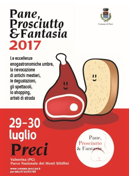 Dopo la mancata edizione dello scorso anno causata dal terremoto in Centro Italia, finalmente a Preci torna la manifestazione “Pane, Prosciutto & Fantasia” sabato 29 e domenica 30 luglio. La mostra mercato, la rievocazione di antichi mestieri e la degustazione di prosciutto IGP di Norcia avverranno a Borgo Preci a differenza delle scorse edizioni. Come da programma, la sagra sarà animata da spettacoli musicali, dimostrazioni pratiche di mestieri come il pastore, il norcino e il canestraio. Per l’evento sarà aperto l’Antico Mulino situato nel Borgo Garibaldi per la dimostrazione “Il Mugnaio all’opera”. Nei pomeriggi dei due giorni avverrà a cura del Post (Perugia Officina per la Scienza e Tecnologia) la dimostrazione pratica della lavorazione del maiale. Ci sarà la consueta presenza della mostra mercato di prodotti tipici del luogo…e non solo!