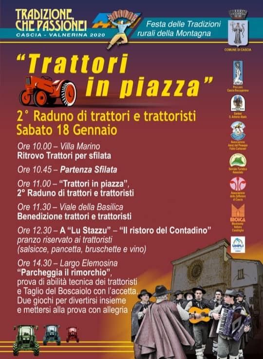 Sabato 18 gennaio, la nota di colore sarà data da “Trattori in piazza”, il 2° Raduno di trattori e trattoristi che vedrà appunto numerosi i mezzi di ogni tipo sfilare fino alla Basilica di Santa Rita per ricevere la benedizione e poi arrivare in piazza. Dopo essersi rifocillati grazie al “Ristoro del Contadino” a loro riservato, dalle 14.30 i trattoristi daranno prova delle loro abilità tecniche con “Parcheggia lu rimorchio” e “Spacca lu cioccu co l’accetta. Due momenti di gioco, dal divertimento assicurato per tutti, per stare insieme in allegria e decretare simbolicamente il miglior trattorista dell’anno. Sempre nel pomeriggio poi, la degustazione della Zuppa del contadino, con farro, zafferano di Cascia e roveja di Civita di Cascia e della Cagliata, il tutto accompagnato da musica folk itinerante. Infine, la serata si chiuderà dalle 20.30 alla Tensostruttura del Parcheggio Porta Orientale con la classica Cena del Contadino in festa con menu della tradizione popolare. (POSTI LIMITATI – Prenotazioni obbligatorie entro il 17/1/20 ore 18.00, presso IAT Valnerina 0743.71401, Maria Rosati 0743.71118 e Edicola Rocchi Orietta 3284243205 – Costo: 16 euro). Durante la cena, Tombolata del contadino e musica popolare.