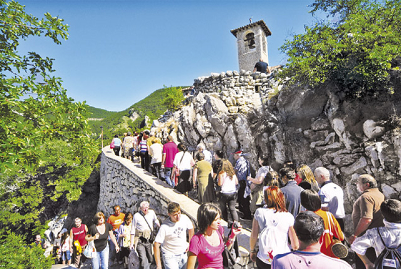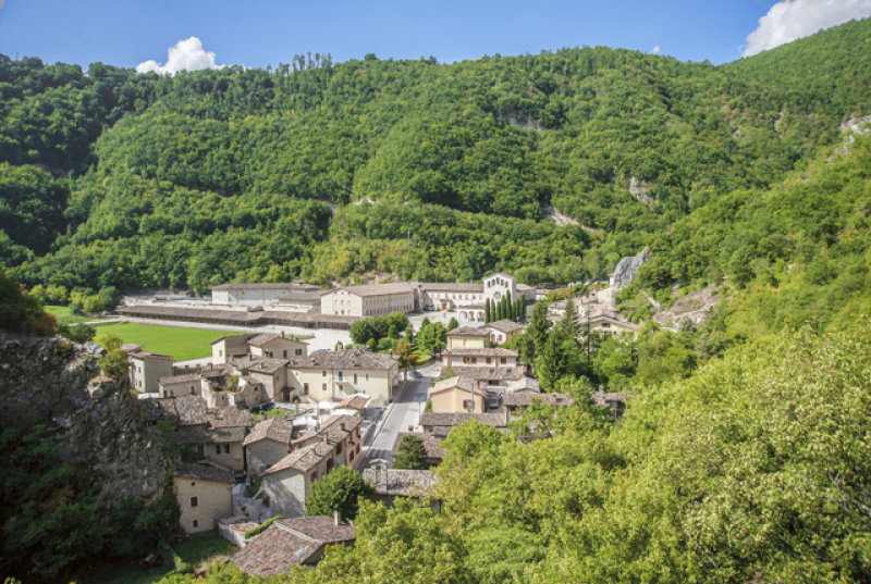 Sulle orme di Santa Rita, seguendo un antico sentiero medievale, che si sviluppa a mezza costa e domina dall’alto i prati e la Valle del Fiume Corno. In alcuni tratti, senza ringhiera, il sentiero si restringe in maniera considerevole, si raccomanda di prestare attenzione. Si parte dalla Chiesa di Santa Maria della Visitazione, che si trova in fondo a Piazza Garibaldi, si prende a sinistra in salita Via del Pago. Superata la sede dell’illustre Confraternita della Buona Morte, si segue sempre Via del Pago, dall’andamento a serpentina. Si prosegue in discesa fino all’altezza del segnale turistico “Santa Rita” si gira a sinistra e si salgono le comode scalette, al termine delle quali prendendo verso destra, in direzione opposta a Cascia, si raggiunge Roccaporena. All’altezza di un trivio si prende la via di mezzo che prosegue in piano. Sulla destra svetta la Torre di Collegiacone, paese natale del marito di Santa Rita. Giunti al ponte in legno lo si attraversa e si raggiunge la strada asfaltata ss320d. Da qui si prosegue verso sinistra su asfalto, e dopo la galleria, si giunge ai piedi dello Scoglio Sacro. A Roccaporena, paese natale di Rita, si possono visitare i luoghi dove la Santa visse prima di entrare in monastero: la casa natale, la casa maritale, il lazzaretto, la Chiesa di San Montano. Si consiglia una visita anche al Santuario ed all’Istituto S. Rita che accoglie giovani da tutto il mondo. Dopo l’ascensione allo Scoglio, si può decidere se tornare con i mezzi pubblici, oppure percorrendo a ritroso il sentiero.
