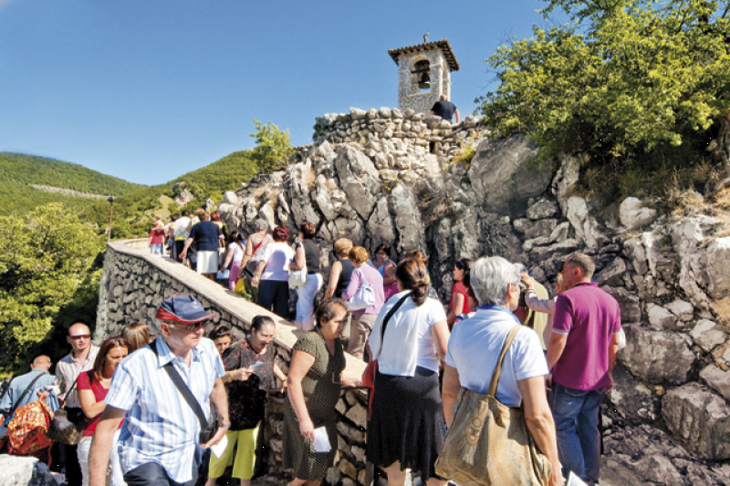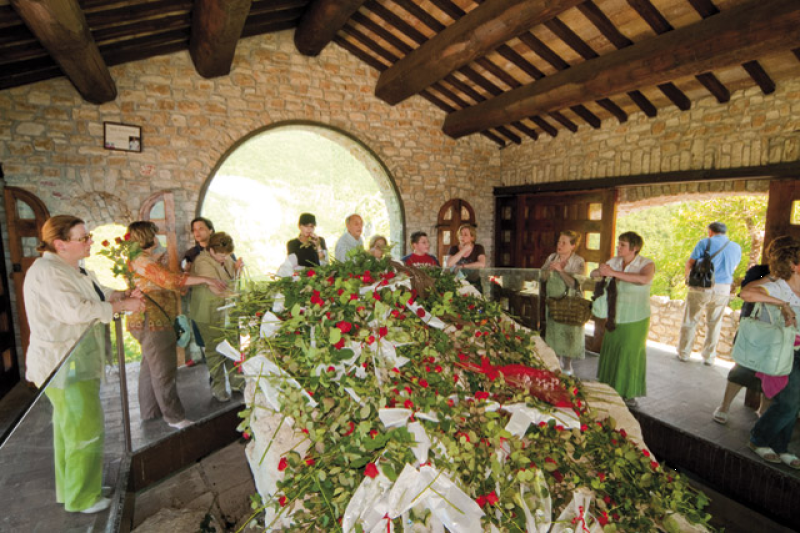 Da Cascia, stretta tra balze montane ove scorre il fiume Corno, l’itinerario si dirige a Roccaporena. Il mormorio del fiume e il frusciare dei pioppi accompagnano il viaggiatore verso il borgo natale di Santa Rita dove, ad attenderlo, s’erge l’erta mole del Sacro Scoglio, lambito dalle acque del fiume Corno che scendono da Leonessa, un tempo altare di culti pagani, di cui si conserva ancora la memoria, ed oggi luogo significativo della devozione a Santa Rita, umile figlia di questi monti.