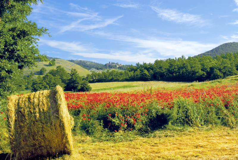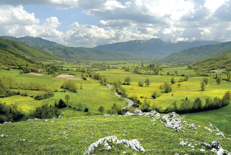 Attraversato l’Altopiano di Chiavano, pettinato da solchi millenari, verde distesa ai piedi di monti solenni, la strada lambisce il borgo di Castel San Giovanni arroccato su uno sperone roccioso.