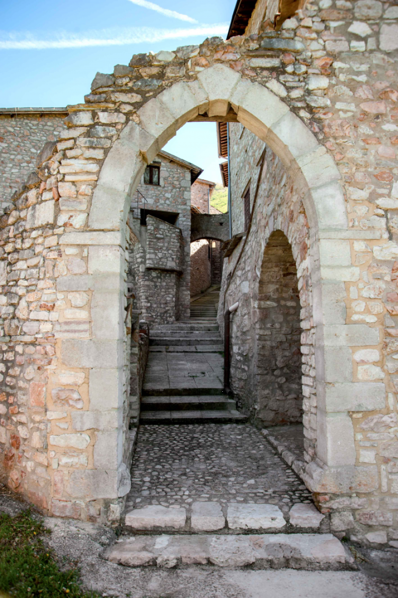 Civitella, nel Comune di Scheggino, si presenta come un castello ellittico di pendio, cinto da mura ben conservate nella parte esposta a sud, lungo uno dei percorsi montani minori che collegavano la Valle del Fiume Nera con il territorio di Monteleone di Spoleto. Questo percorso è testimoniato anche dall`esistenza, a partire dal tardo medioevo, di un pellegrinaio chiamato Hospitaìe S. Crucis che sorgeva nei pressi di Civitella e che la tradizione identifica invece con un edificio con portale architravato e scolpito, accanto alla parrocchiale.