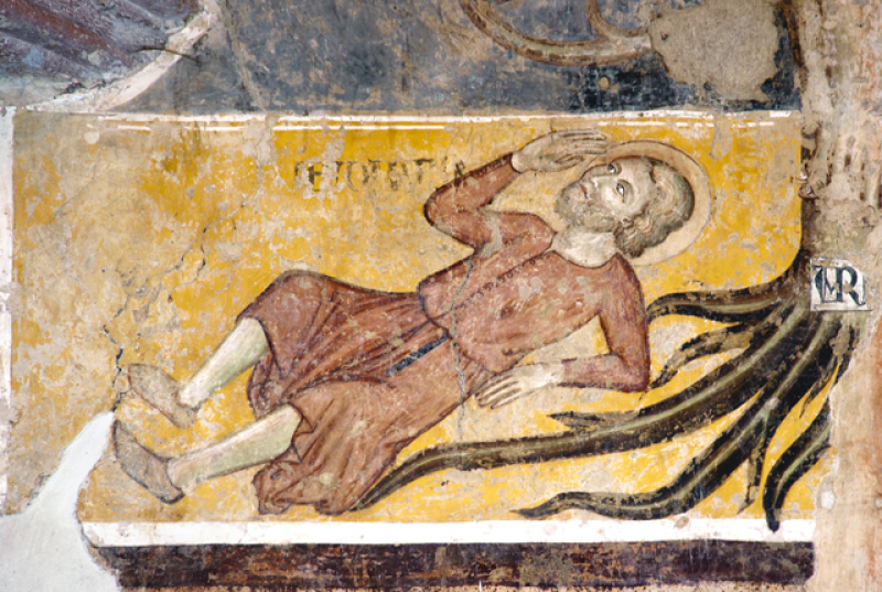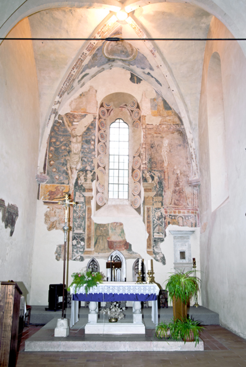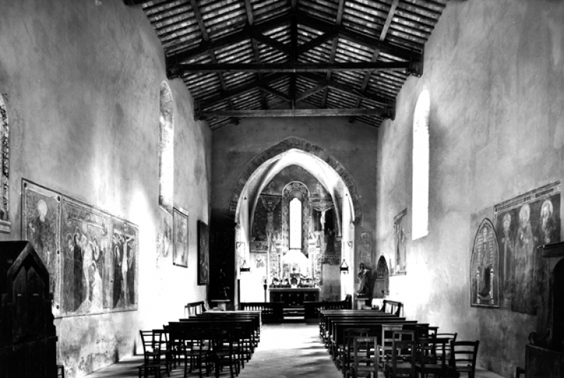 Nella parete di fondo del coro gli affreschi si distinguono, secondo la cronologia, in tre gruppi. Il più antico, riferibile ai primi anni del sec. XIV, comprende le due grandi immagini del Crocifisso ai lati della monofora (a sinistra, nell`iconografia simbolica della croce si innalza sulla figura di Adamo, purificato dal sangue di Cristo; a destra, nell`iconografia storica del Cristo in croce con a fianco la Maddalena) e la lunetta di incerto soggetto di cui restano due figure di offerenti. Il secondo, in basso ai lati, comprende il S. Ludovico e la Madonna del sec. XV. Il terzo è costituito dal riquadro sotto la monofora (mutilato quando questa fu riaperta), ornato di ricca cornice e di candelabri, raffigurante la Madonna in trono con S. Francesco e un altro Santo francescano.