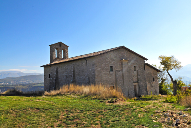 Ex-parrocchiale e già priorale, fu edificata con il convento (di cui oggi rimangono vari elementi) annesso nel 1121 da Pietro IV abate di Sassovivo di Foligno. Del carattere romanico originario conserva l`abside, la monofora e le semicolonne. La facciata a capanna con doppio spiovente (avente forse un piccolo rosone al centro) presenta due portali, uno dei quali del 1619. Piccolo campaniletto a vela da un lato. Accanto, a destra, sorgeva un piccolo chiostro per riparare i coloni dalle intemperie.