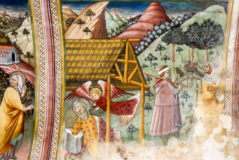 La volta della navata centrale era occupata da sei storie di Gioacchino e Anna e della Vergine di cui sopravvivono più o meno integri quattro episodi e alcune scritte lacunose esplicative dell`intero ciclo in vernacolo; l`autore va riconosciuto in Giovanni Sparapane che qui parla uno squillante linguaggio tardo-gotico, quasi originato dalla prossimità geografica e culturale di Camerino e Foligno, senza trascurare i debiti contratti con Nicola da Siena, già da tempo installato in zona. casino online stranieri