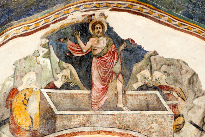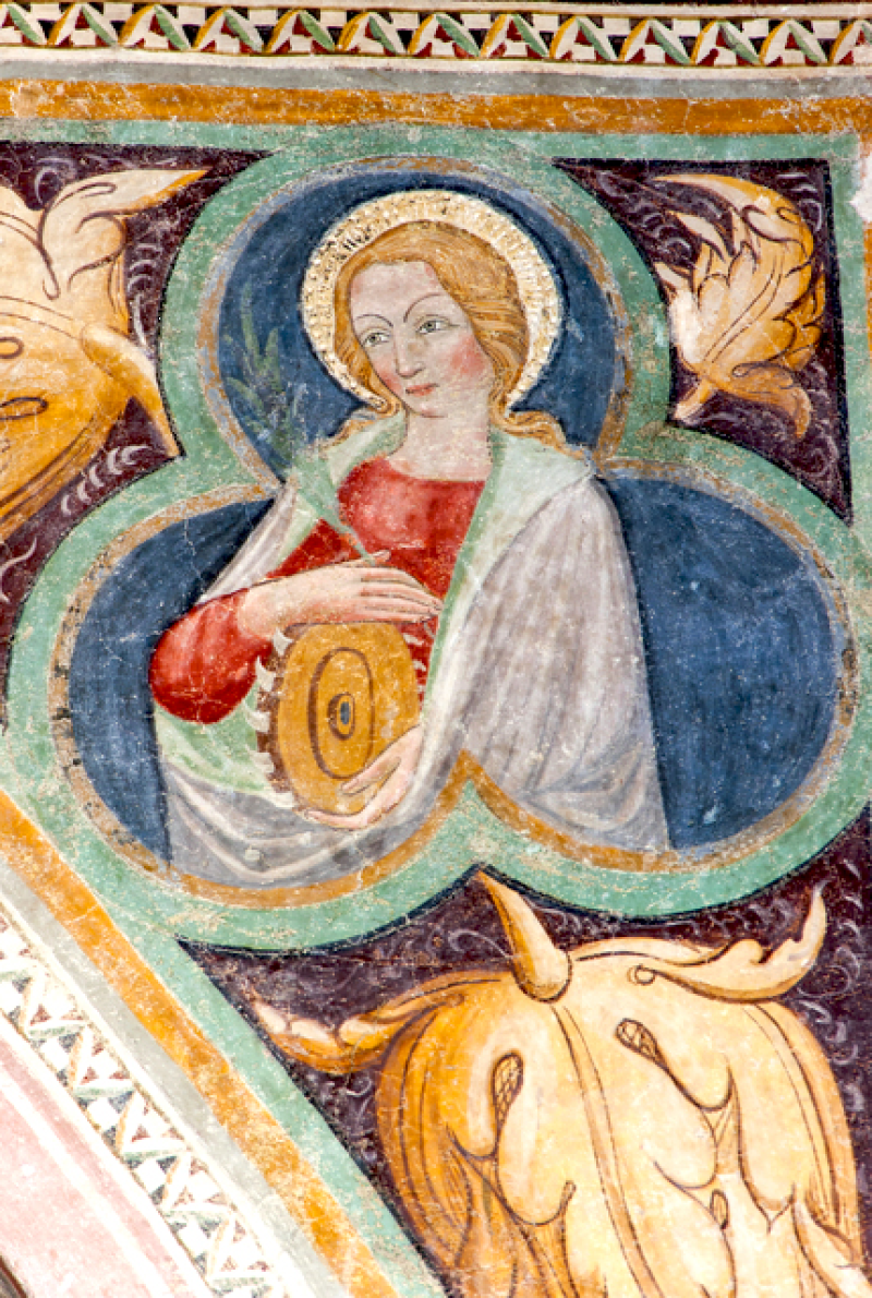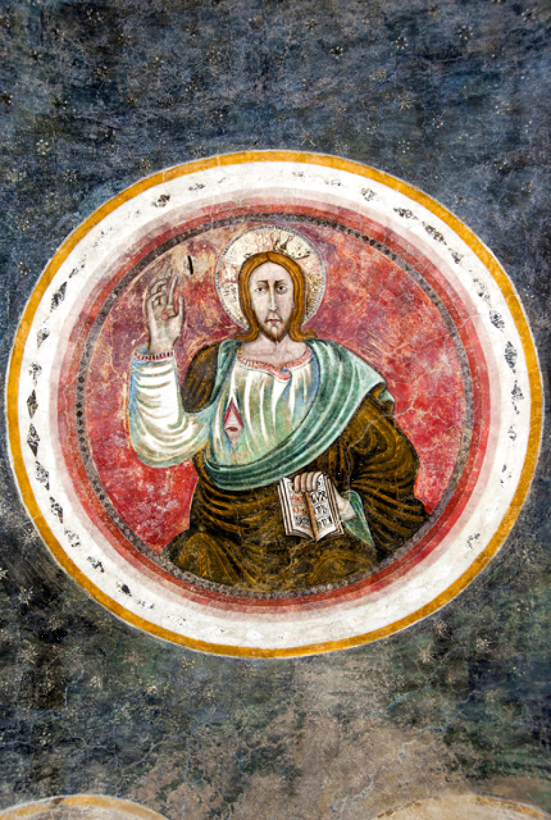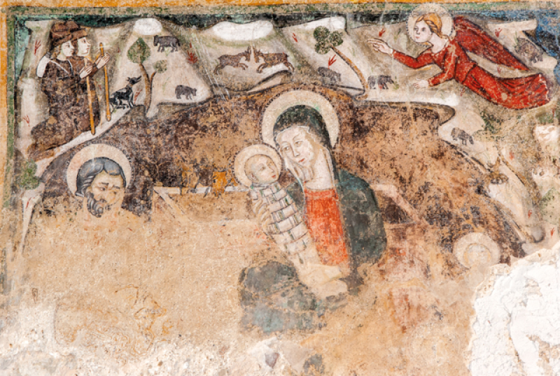 A fianco del primitivo ingresso c`è un Angelo trecentesco con altri frammenti; sulla vota a botte episodi della Passione di Cristo e almeno cinque tondi sotto la scialbatura, di schema giottesco; nei sottarchi Profeti con cartigli.