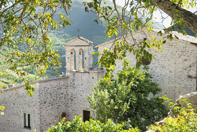 Inside, on the left wall, Visitation of 1573, canvas by Camillo Angelucci from Mevale, belonging to one of the most important dynasties of painters of Valnerina; considerable canvases of the 17th century depicting St Benedict and St. Scolastica, Saints Michael Archangel, James and Filippo Neri. Three walls preserve a good part of the fresco decoration of the 15th century. Some of them, which can be dated to around the mid 15th century, seem similar to the frescoes of Santa Maria in Vallo di Nera, connected to the style of the Master from Eggi. To the right of the door which leads to a small adjacent space, Christ in glory with Angels bearing the symbols of the passion and St. Michael Archangel and praying figures of the 15th century. In the small area to the right, frescoes of the late 14th century: Stories of the passion; St. Catherine and holy martyr of good quality and all by a single author.