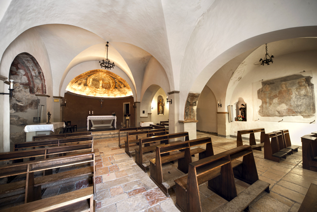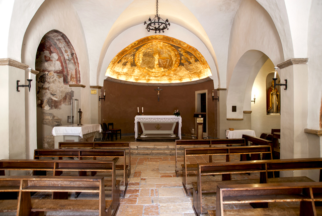 The interior is divided in two naves, covered by vaults; in the left nave, added in XVI century, are niches decorated by frescoes with images of Saints (amongst them, in the second niche, the hermits Macario and Bordone), from 1570, work of painters from Valnerina. On the pillar at the font is painted a Crucifix between Saint Anthony and the Blessed Rita (with a halo although not yet blessed), the authors are the Sparapane. Some other votive frescoes from the XV and XVI centuries, one of them with the Holder Saint`s image, are on the right wall, unfortunately in bad state of preservation and heavily restored. They are the work of an artist from Valnerina, receiving the influence from Marche, from the early XV century. On the dome of the apse (the only part remaining from the original Romanesque nave) is the Coronation of the Virgin; the underside of the arch is decorated with scrolls faced in the Renaissance style. Also the sixteenth-century stone baptistery is in Renaissance style. In sacristy, Lascaris found (1712) a chalice of golden copper conic cupped from the XVI century and a very simple processional cross of umbrian jewelry from the late XV century.