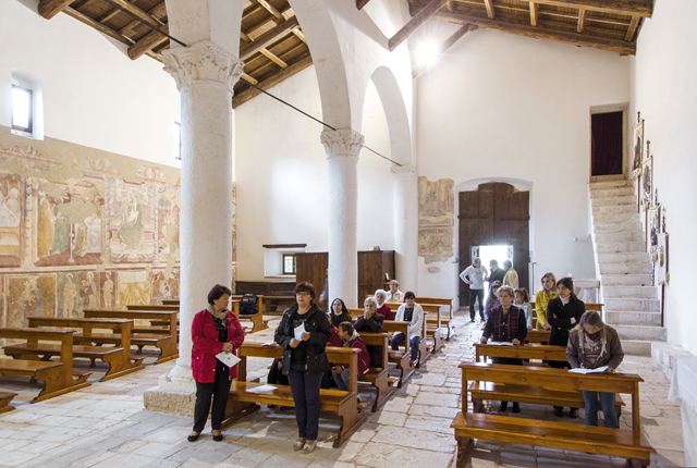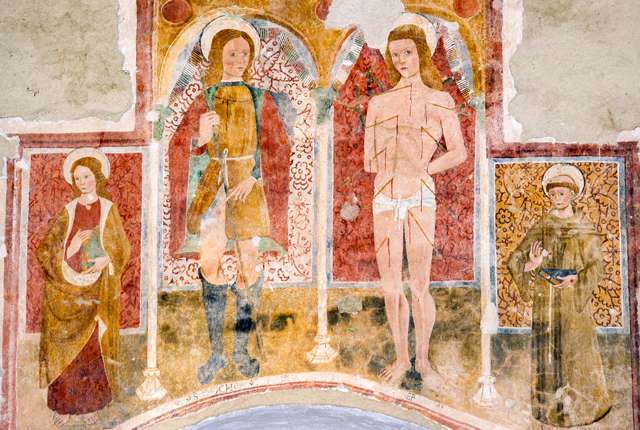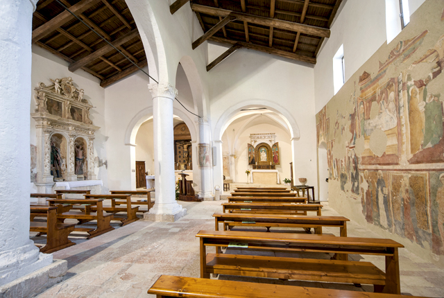 The façade of the Church of Madonna Bianca, which faces on to the Campiana Valley, presents a Gothic portal, but is clad in a fresco decoration of the 15th century; at its side, an external shrine is decorated by frescoes of the Sparapane workshop.