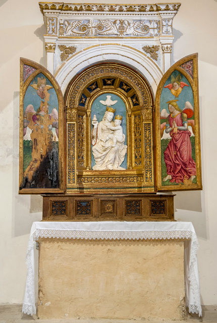 Inside, the statue of the White Madonna is silhouetted against an azure background. This is a high-relief in marble, attributed to Francesco di Simone Ferrucci from Fiesole (influenced by Andrea del Verrocchio), sculpted in 1488. It demonstrates the intense commercial relations of this area of the Valnerina with Tuscany.
