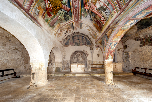 The entrance leads to the first nave with a mottled floor dating back to 1562 and a barrel vaulted ceiling resting on six pillars. The central wooden altar rests against a large arch decorated with the remains of raceme inflorescences (15th century). In the seventeenth century, panels of a polyptych attributed to Antonio Sparapane were placed here (15th century). On the right-hand wooden altar there is an interesting Madonna dei Raccomandati on canvas (locally named the Madonna “with outspread arms”), dated 1641.