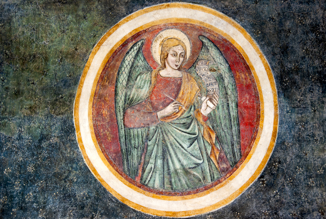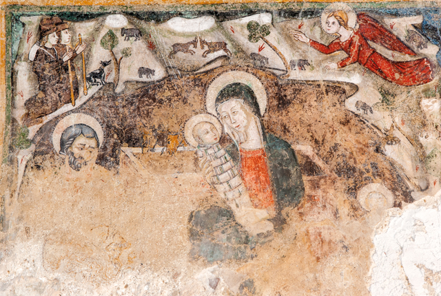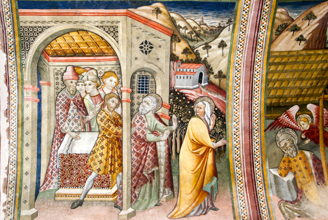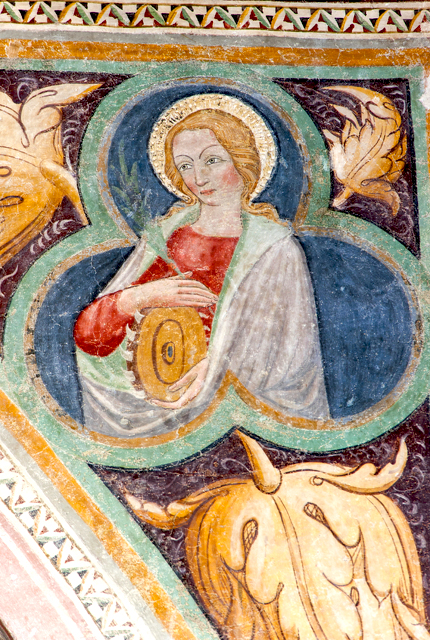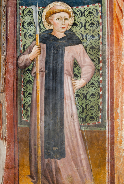 The vault of the central nave used to be painted with six stories of Joachim and Ann and the Virgin Mary, of which four episodes have remained more or less intact. The painter was Giovanni Sparapane, who expresses himself here in a shrill, late Gothic style, which originated from the close geographical and cultural position of Camerino and Foligno, not forgetting his debts to Nicola da Siena. The other images appear to be by a different hand: a gentle woodman, St. Amico, who instead of an axe has a fixed bill hook and holds the rope, with which the lion, who devoured the donkey, was supposed to be tied up; and an energetic St. Anthony, in the role of abbot.