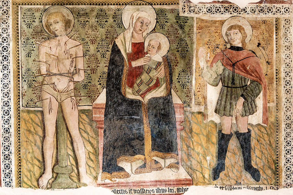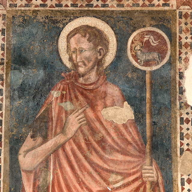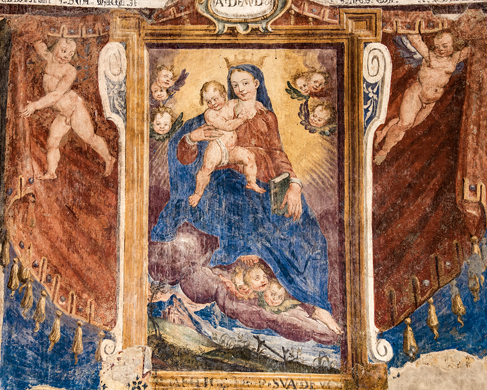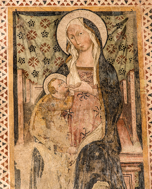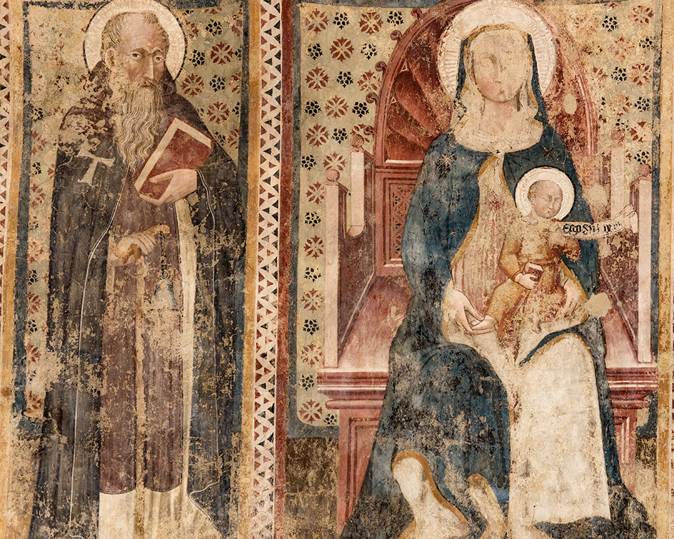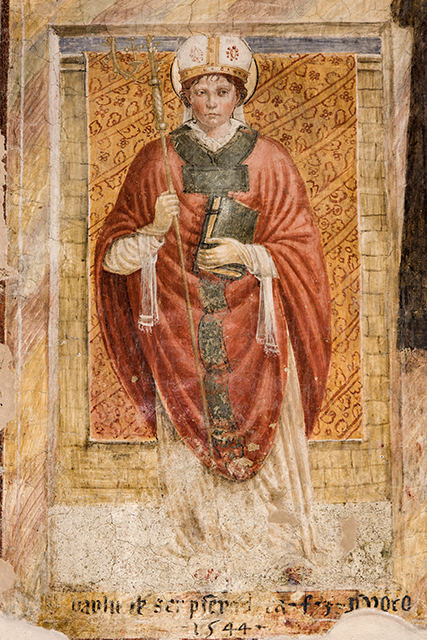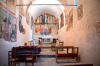 The interior is a rare example of a Romanesque interior which has preserved the fresco decoration with which it was enriched, at different times, to clad the walls almost entirely. The frescoes on the bottom wall are datable to around the late 14th century or to the early next century.