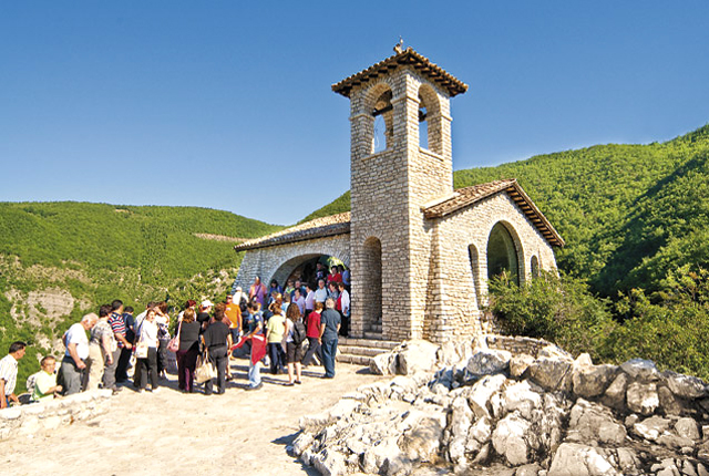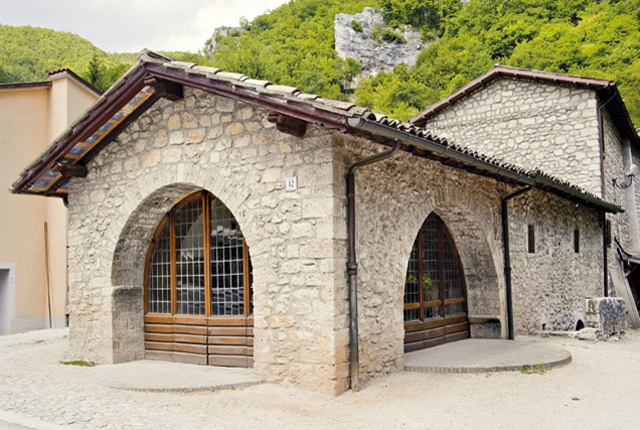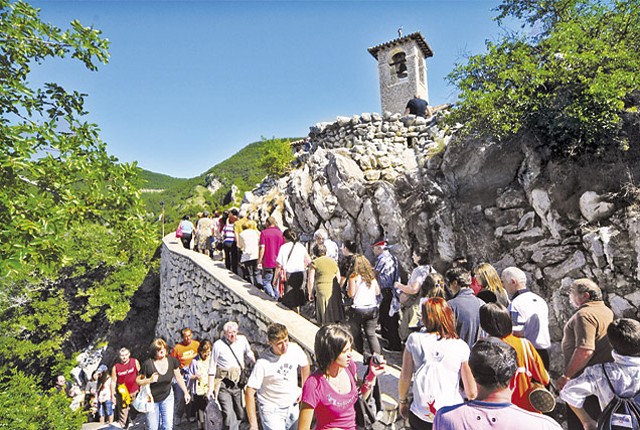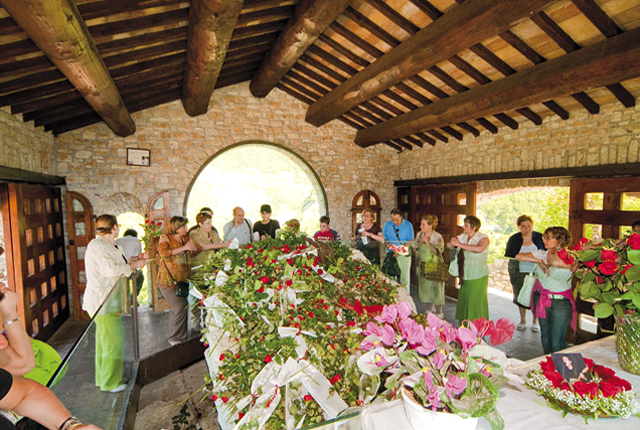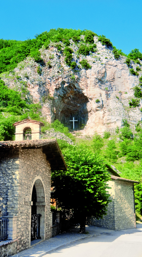 A few kilometres on, just as the gorge widens and branches off at the exact centre of the Corno fork, rises the Sacred cliff of Roccaporena: a bare pale pyramid, the tip of which is lost in the azure of the sky. In front of the Sacred Cliff, high up on Roccaperona, the Grotta d’Oro (“Golden Grotto”), a semicircular shallow spacious cave, opens up in the crag. In the same crag, about a hundred meters as the crow flies from the Grotta d’Oro, separated by stone blades, is the Miracle garden, a modern transposition of the garden in which, in midwinter, the fruits wished for by Rita on her deathbed and granted by her Groom were picked and brought to her: freshly blossomed roses and figs. The surface of the bronze statue of dying Rita, which is located in front of the garden, has become smooth thanks to the caresses of the innumerable imploring hands, the kisses and handkerchiefs passed over the image in the hope that they might absorb the power of holiness.